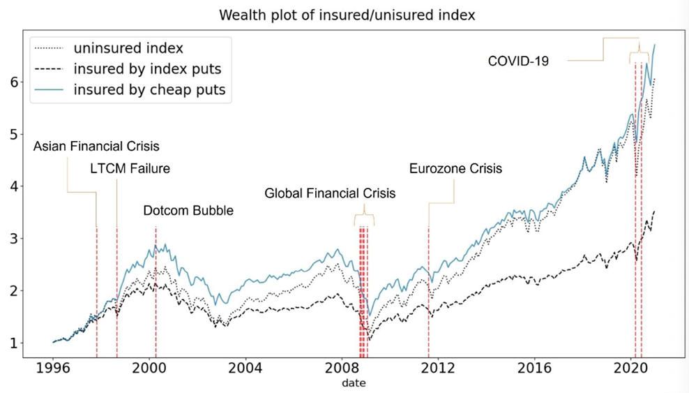 Hedging tail risk using index put options exerts a drag on portfolio return, exemplified by the widegap between the unhedged portfolio (dotted line) and the hedged portfolio using index options (dashed line). On the other hand, our price-based heuristic that selects cheap equity options (solid line) successfully exploit the asymmetry in market level correlation under different market conditions to hedge tail risk